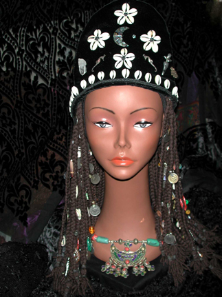 This headdress was created by hand for a "Guedra", directed by Katarina Burda, which was part of the "Don’t Let My People Die" Benefit, November 10, 2005 at the Brava Theatre in SF. Traditionally speaking the Guedra of the Tuareg Tribe of North Africa, is a blessing ceremony. The chanting is in Arabic. Many recycled materials went into this piece, including gifted 'baubles' used to adorn the brown wool braids. For additional images of a few of the costumes I have made over the years, etc., see: Portraits of Maureen &.... (currently Flickr is holding hundreds of images hostage!)